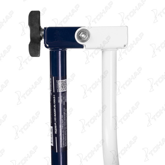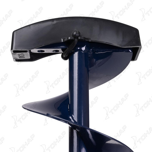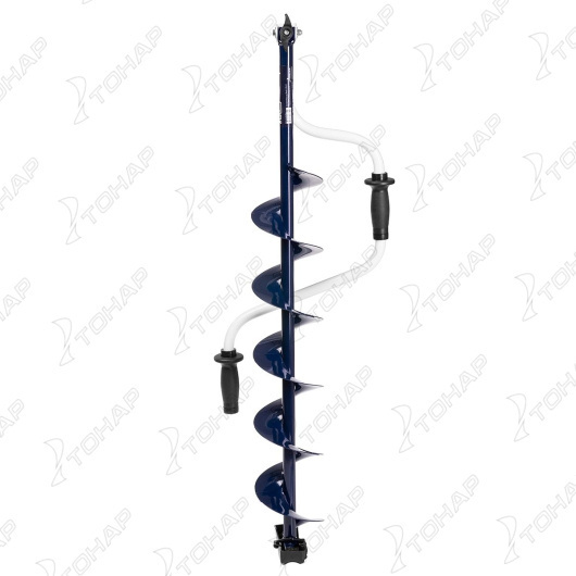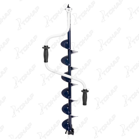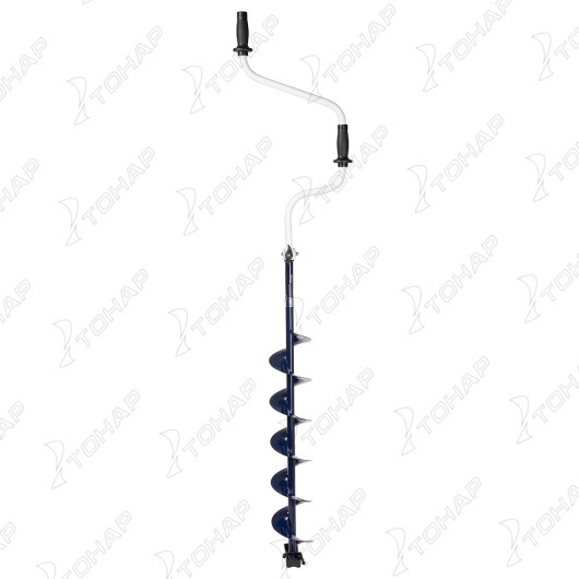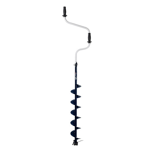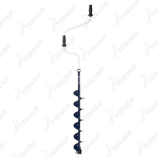 Верхняя рукоятка ледобура смещена относительно оси шнека на 130 мм, а нижняя на 150 мм. Такое расположение рукояток позволяет вращать ледобур одновременно двумя руками, тем самым, не прикладывая особых усилий, увеличивая скорость бурения лунок во льду.