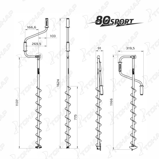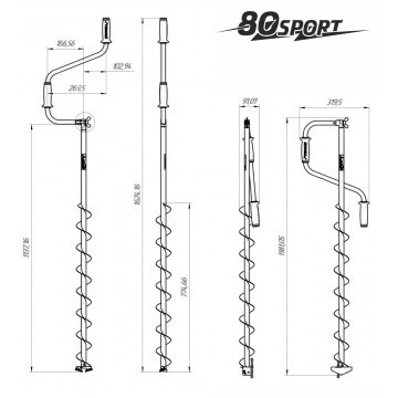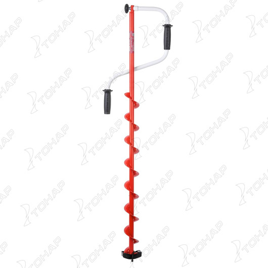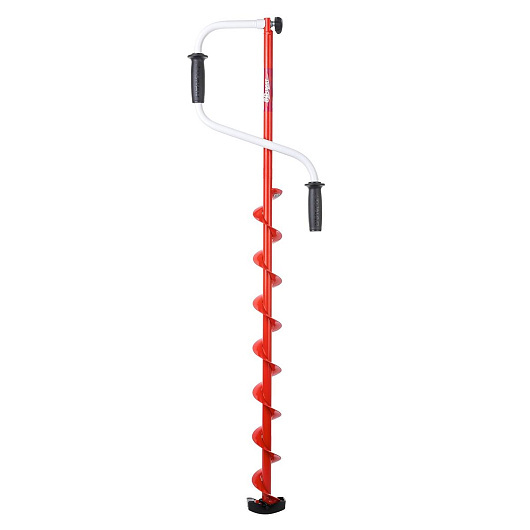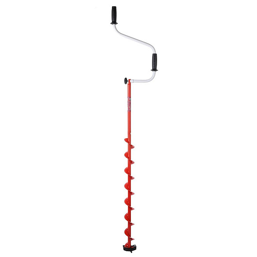 Верхняя рукоятка ледобура смещена относительно оси ледобура на 105 мм, а нижняя на 165 мм. Такое расположение рукояток позволяет вращать ледобур одновременно двумя руками, тем самым увеличивая скорость бурения лунок во льду.