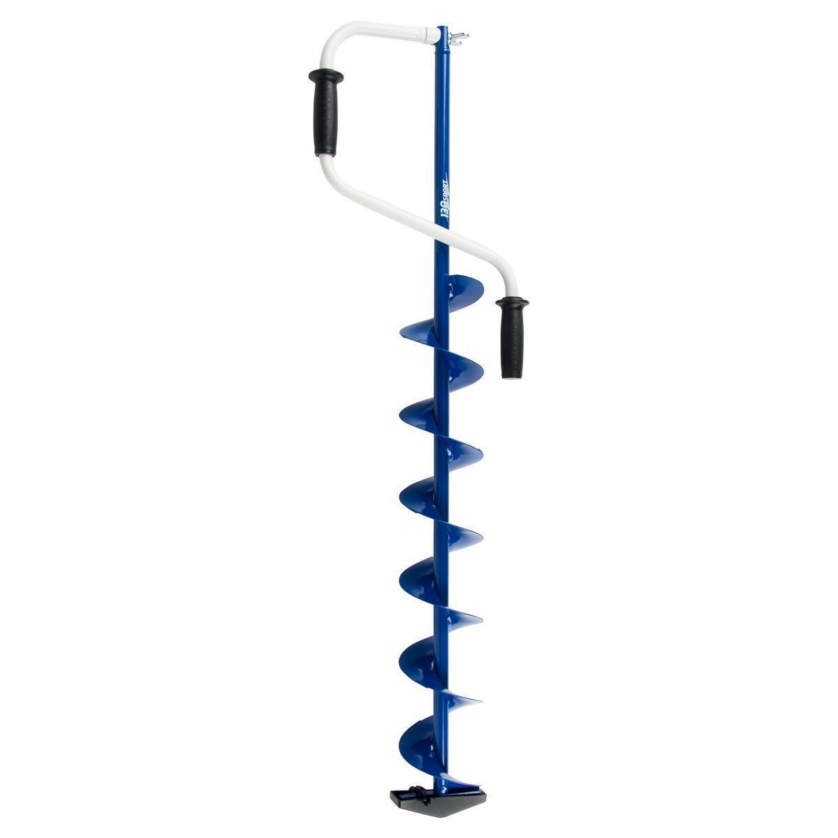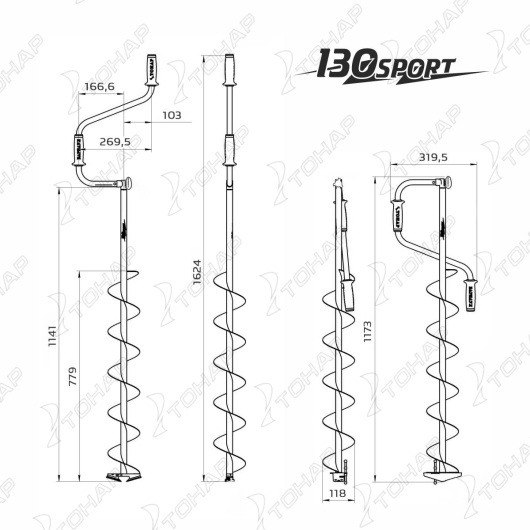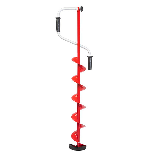 Верхняя рукоятка ледобура смещена относительно оси ледобура на 105 мм, а нижняя на 165 мм. Такое расположение рукояток позволяет вращать ледобур одновременно двумя руками, тем самым увеличивая скорость бурения лунок во льду.
