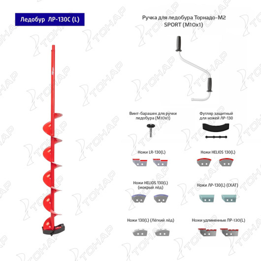 Ледобур комплектуется стандартными ножами 'ТОНАР', Также можно установить полукруглые ножи Helios 130, максимально адаптированные под бурение любого типа льда, в том числе и мокрого льда.